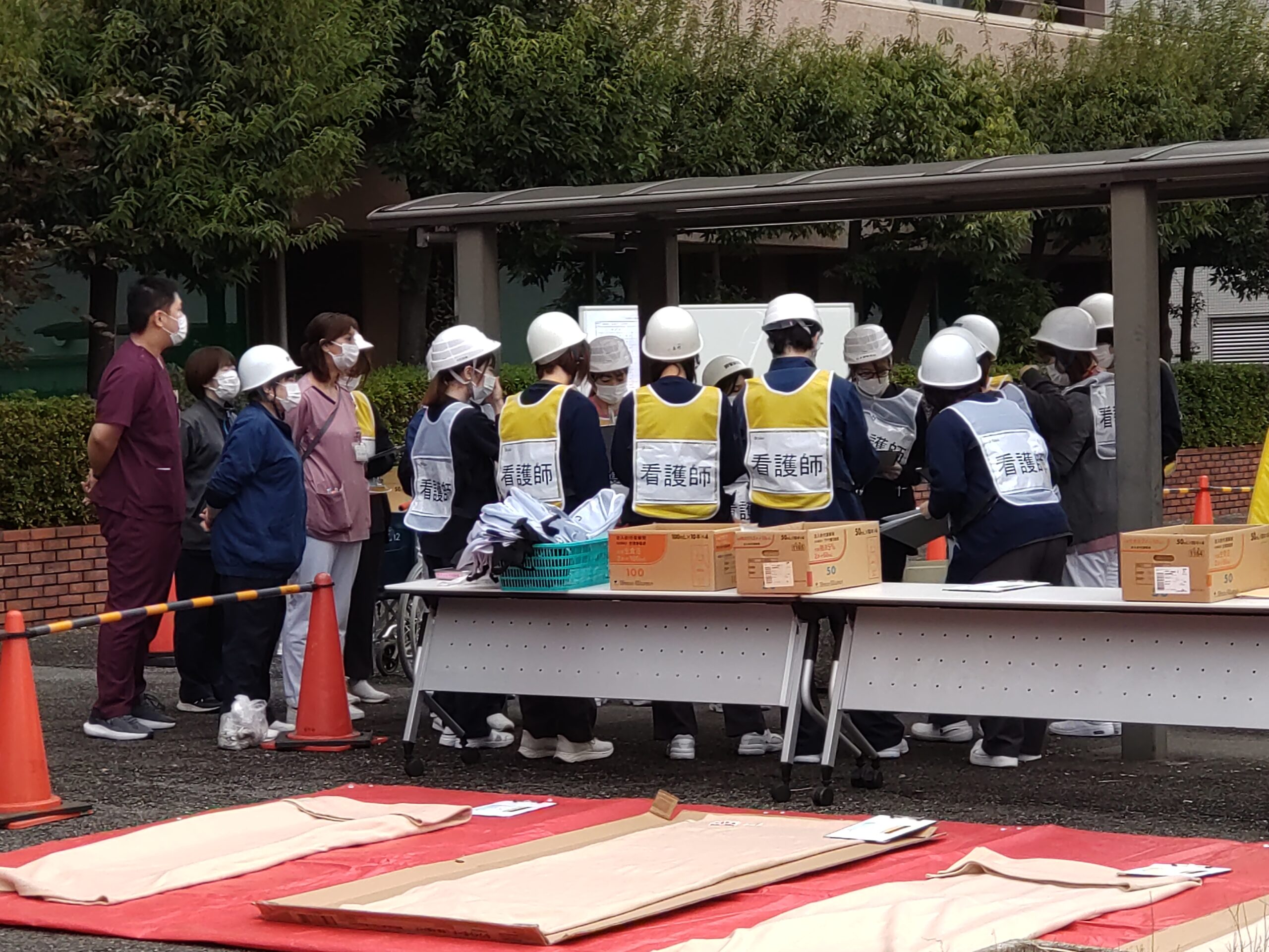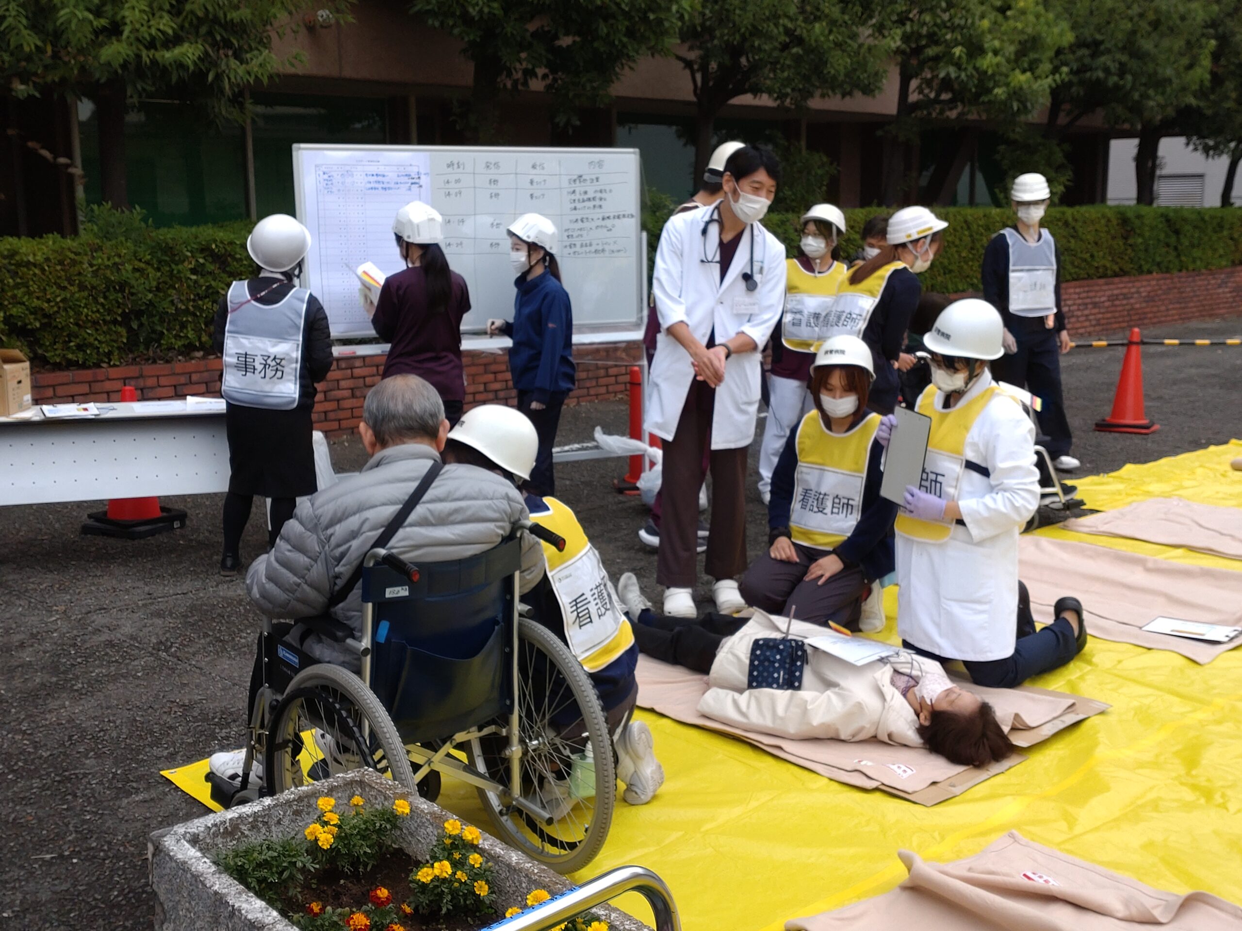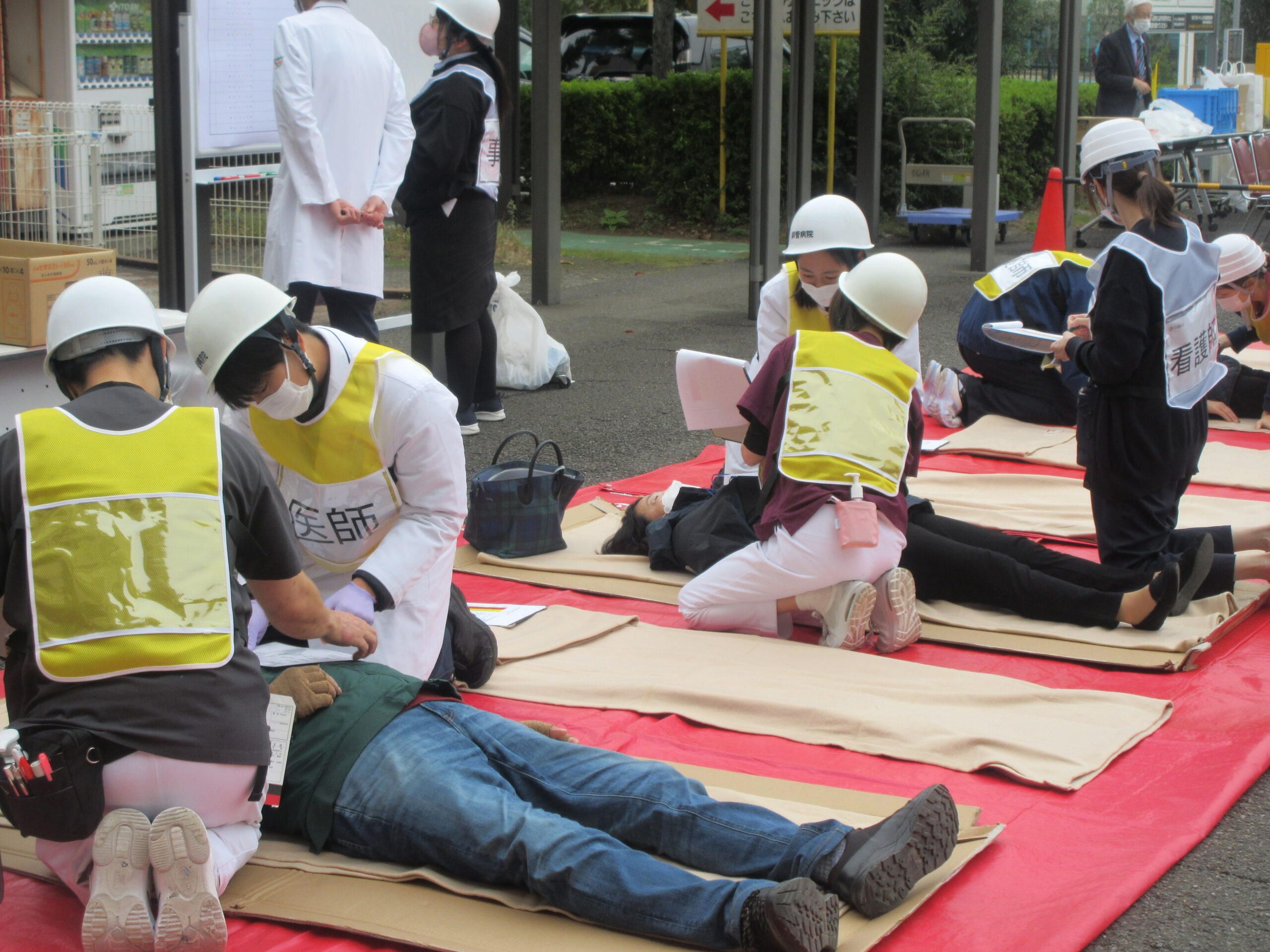症例を元にトリアージから診断→入院・転院搬送判断までを実践訓練し、医師・看護師・コメディカル・事務など様々な職種が参加し、災害時を想定して協力体制をとって行っております。